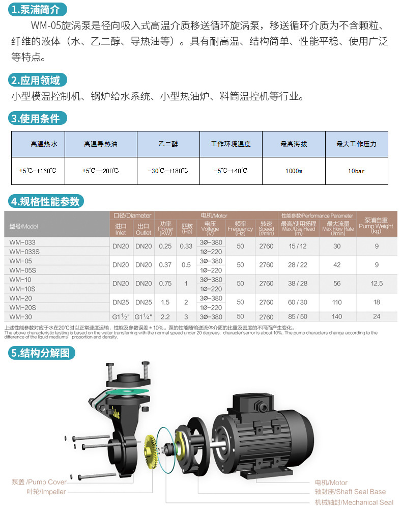 產(chǎn)品描述:1.泵浦簡(jiǎn)介: WM系列旋渦泵是徑向吸入式高溫介質(zhì)移送循環(huán)旋渦泵,移送循環(huán)介質(zhì)為不含顆粒、纖維的液體(水、乙二醇、導(dǎo)熱油等)。具有耐高溫、結(jié)構(gòu)簡(jiǎn)單、性能穩(wěn)定、使用廣泛等特點(diǎn)。 2.應(yīng)用領(lǐng)域: 小型模溫控制機(jī)、鍋爐給水系統(tǒng)、小型熱油爐、料筒溫控機(jī)等行業(yè)。