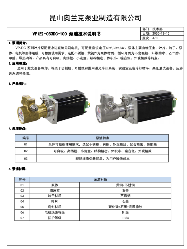 產(chǎn)品描述:泵浦簡介: VP-DC 系列葉片泵配置永磁直流無刷電機,可配置直流電壓48V\36V\24V。泵體主要由增壓室、葉片、轉(zhuǎn)子、泵 體、電機等部件組成,可根據(jù)使用需求,選配不銹鋼、黃銅作為泵體材質(zhì);循環(huán)介質(zhì)為不含顆粒、纖維的水、乙二醇、 甲醇、導(dǎo)熱油等。產(chǎn)品具有可自吸、高揚程、小流量、結(jié)構(gòu)精密、體積小、噪音低、外觀精致等特點。 2.應(yīng)用領(lǐng)域: 適用于激光設(shè)備冷卻、等離子切割機、X 射線和醫(yī)用激光冷卻系統(tǒng)、實驗室設(shè)備冷卻循環(huán)、高壓清洗設(shè)備、反滲 透系統(tǒng)等領(lǐng)域